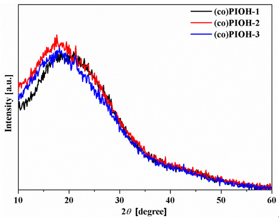 - The influence of the stiffening of the polymer chain due to the hindered rotation of the benzene ring with the –CH3 groups ((co)PIOH-3) and reduced intermolecular attraction forces in hydrogen bond formation ((co)PIOH-1 and (co)PIOH-2) on the value of Tg was observed.