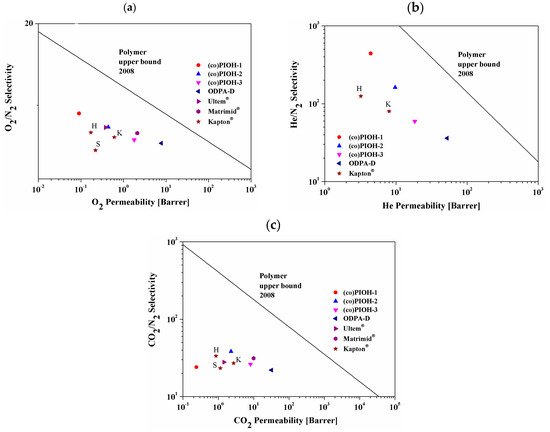 - Liu, Q.; Paul, D.R.; Freeman, B.D. Gas permeation and mechanical properties of thermally rearranged (TR) copolyimides. Polymer 2016, 82, 378–391. [Google Scholar] [CrossRef]