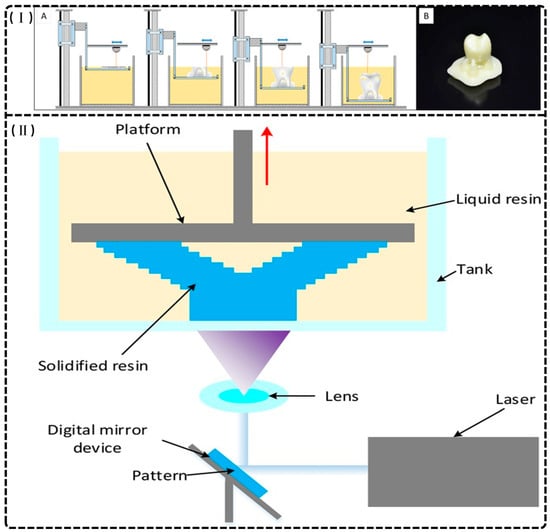 (I) Stereolithography printing. (A) The layer-by-layer printing process. (B) An example of a crown printed with stereolithography prior to the removal of supports and polishing. Reprinted with permission from [14]. (II) A schematic of the printer components and printing procedure of digital light projection (DLP), the red arrow represents the rising direction of the platform. Reprinted with permission from [22].