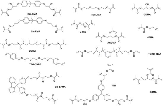 Photopolymerizable monomers—reactive molecules capable of forming polymeric networks—undergo radical or cationic polymerization via light-activated initiators, facilitating cross-linking critical for mechanical stability [9,46]. Contemporary dental resins combine high-molecular-weight base monomers (2,2-bis[4-(2-hydroxy-3-methacryloyloxypropoxy) phenyl] propane (BisGMA), ethoxylated BisGMA (Bis-EMA), and urethane dimethacrylate (UDMA)) with diluents (triethyleneglycol dimethacrylate (TEGDMA), decanediol dimethacrylate (D3MA), and 2-hydroxyethyl (HEMA)) to optimize viscosity and polymerization kinetics (Figure 2) [47,48]. These formulations exploit carbon–carbon double bonds to achieve rapid polymerization, yielding requisite mechanical strength and dimensional stability [30,41,49]. Though widely used since 1962, BisGMA (MW 512.6 g/mol, η = 1369 Pa·s) requires blending with low-viscosity TEGDMA (η = 0.05 Pa·s) to improve handling and degree of conversion [47,50]. Alternative monomers address specific limitations: Bis-EMA (η = 0.9 Pa·s) reduces shrinkage stress, glycerol dimethacrylate (GDMA), acetylated glycerol dimethacrylate (AGDMA) and glycerol trimethacrylate (GTMA) mitigate toxicity concerns, and BPA-free formulations (e.g., 9,9-Bis[4-((2-(2-methacryloyloxy)ethyl-carbamate)ethoxy)phenyl]fluorene (Bis-EFMA), trimethacrylate tris(4-hydroxyphenyl)methane triglycidyl methacrylate (TTM)) address biocompatibility issues [51,52,53]. Lin et al. demonstrated that optimized blends (80% Bis-EMA, 10% UDMA, 10% TEGDMA) achieve 0.051 mm accuracy with flexural strengths of 60–90 MPa [30], while novel urethane acrylics (urethane acrylate TMXDI-HEA) exhibit superior mechanical properties—40% higher modulus and 21% greater flexural strength than UDMA [54]. Despite these advancements, diluent-induced polymerization shrinkage has prompted investigation of alternatives like triethylene glycol divinylbenzyl ether TEG-DVBE, which enhances hydrolytic stability when combined with UDMA [55].