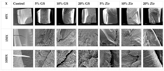 Representative SEM images (magnification 40×, 150×, and 1000×) of the fracture surface of tested groups: control, glass silica 5 wt% (GS 5%), glass silica 10 wt% (GS 10%), glass silica 20 wt% (GS 20%), zirconia 5 wt% (Zir 5%), zirconia 10 wt% (Zir 10%), and zirconia 20 wt% (Zir 20%) [45].