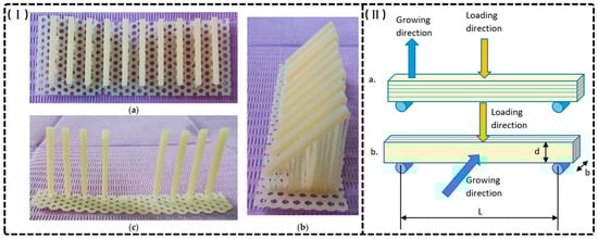 (I) The printed specimens made of DETAX on three different directions: 0, 45, and 90 degrees. (a) 0°; (b) 45°; (c) 90°. (II) Loading directions (a) perpendicular to growing direction; (b) parallel to growing direction. b—specimen thickness, d—specimen depth, L—span between supports [43].
