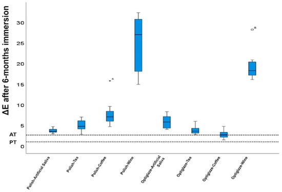 The significance of the color changes on the acceptability threshold (AT) and perceptibility threshold (PT) tested for ΔE after 6-month immersions. AT is defined as 2.7 and PT is defined as 1.0. * Represents ΔE from Haselton et al. (doi: 10.1016/j.prosdent.2004.09.025). The circle Represents ΔE from Tom et al. (doi: 10.15713/ins.jcri.141). Reprinted with permission from [132].