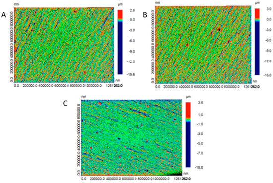 Surface roughness micrographs for study samples in (A) conventional, (B) CAD/CAM, and (C) 3D printing groups [86].