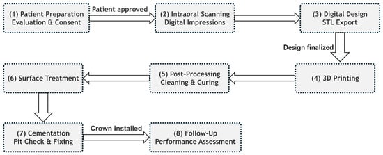 Computer-aided design and computer-aided manufacturing (CAD/CAM) technologies have revolutionized prosthodontics through enhanced precision, standardization, and efficiency [6,7]. While subtractive manufacturing (milling) has dominated digital workflows for provisional restorations in recent years, additive manufacturing (3D printing) has emerged as a compelling alternative due to its material conservation, geometric freedom, and cost-effectiveness [5,8,9,10,11,12]. The clinical potential of 3D printing is particularly evident in fabricating provisional crowns and bridges, with single-unit restorations printable in approximately 20 min. This efficiency allows clinicians to prepare a tooth, scan it, initiate printing, and proceed with other treatments while the restoration is manufactured. Once complete, the crown can be immediately detached from supports and cemented, thereby streamlining clinical workflow without compromising restoration quality [13,14,15].