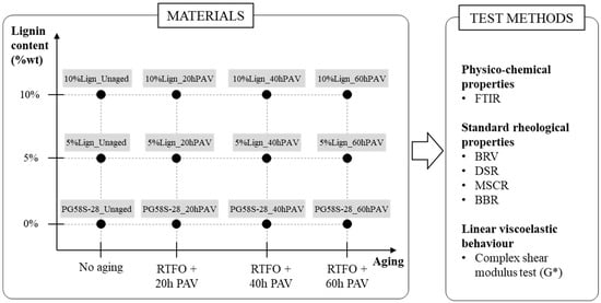The experimental plan of this study is laid out in Figure 1. From the same unmodified bitumen, a performance grade (PG) 58S–28, and the same Kraft lignin source, a total of twelve bitumens were produced to build a full 3 × 4 experimental matrix, with three (3) different lignin contents and four (4) different aging levels.