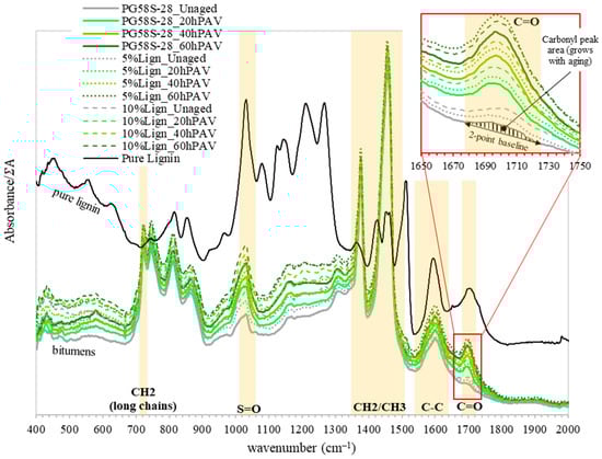 The FTIR spectra of all bitumens and of the pure Kraft lignin are plotted in Figure 2. For better comparison, for each sample, the absorbance was normalized by the sum of peak areas ΣA, as defined in Section 2.6.1. The unit in the y-axis was removed since it is meaningless, and only the relative change in peak areas between material matters. A zoom on the carbonyl peaks is provided to illustrate the measurement of the peak area with a two-point baseline.