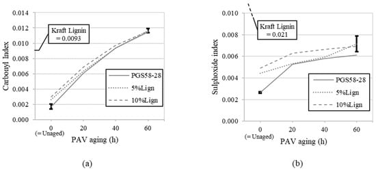 Figure 3. (a) Carbonyl indices and (b) sulphoxide indices as a function of PAV aging. Error bars represent standard deviations (SD) on the virgin PG58S–28 and on the modified and aged 10%Lign_60hPAV.