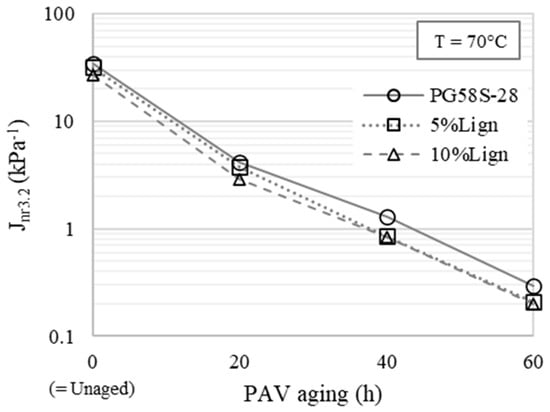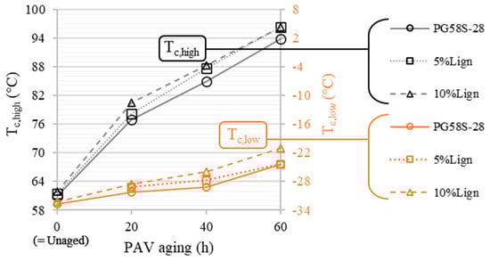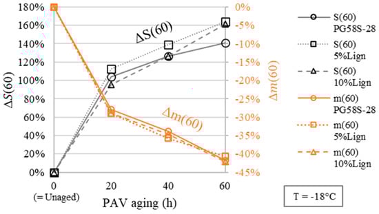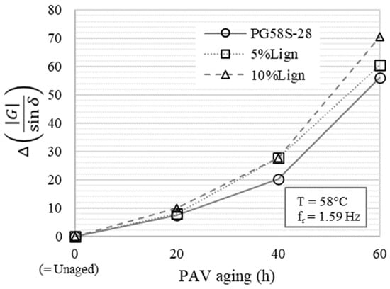 For each lignin content, the bitumens were subjected to four (4) levels of aging (x-axis: Figure 1): unaged and combined STA with RTFO and LTA with PAV for 20, 40, or 60 h. The bitumens were subjected to up to 60 h (a noticeably long period) of PAV in order to fully grasp the anti-aging potential of the lignin.