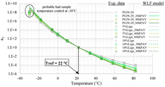Regarding G* analysis, the time–temperature superposition principle (TTSP) was first assessed. If the TTSP was validated, the shift coefficients (aT,exp) were determined and then modelled (aT,WLF) with a William–Landel–Ferry (WLF) law, expressed in Equation (6). The 2S2P1D (2 Springs, 2 Parabolic, and 1 Dashpot) rheological model was chosen and calibrated to simulate the complex modulus (G*2S2P1D). It is a 7-parameter model, formalized in Equations (7) and (8). Details on those parameters and their relation to intrinsic material properties can be found in the original article [66]. Both WLF and 2S2P1D model coefficients were calibrated for a reference temperature Tref arbitrarily taken at 22 °C.