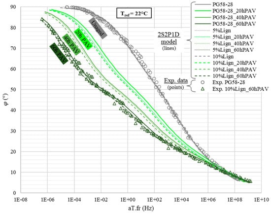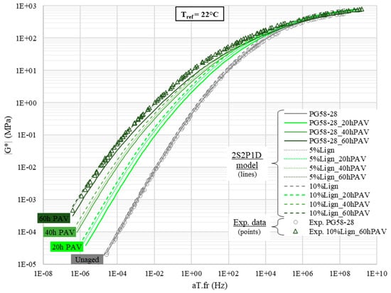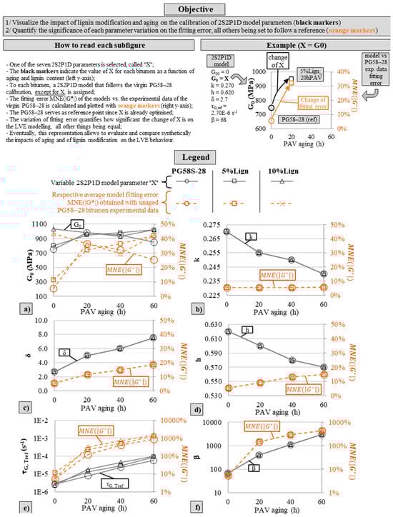 A focus on the lignin modification clearly shows that the low-dosage lignin content has a very limited impact on the LVE behaviour and exhibits no anti-aging property when considering the whole G* spectrum. Indeed, four out of six 2S2P1D parameters, k, h, δ and β (respectively Figure 11b–d,f) are simply unaffected by the lignin content. Those constants are known to vary with the composition of the bitumen (with another crude oil source, with SBS polymer modification, etc.). G0 and τG,Tref (Figure 11a,e) appear to increase only slightly without any clear cross-effect with aging. The variations in those two parameters are typical of the stiffening effect of inert fillers (e.g., limestone), as previous research on bituminous mastic has demonstrated [69]. This observation confirms and extends the previous conclusions on the limited stiffening effect and non-existing anti-aging potential of the Kraft lignin used in this study found with the standard rheological tests in Section 3.2.