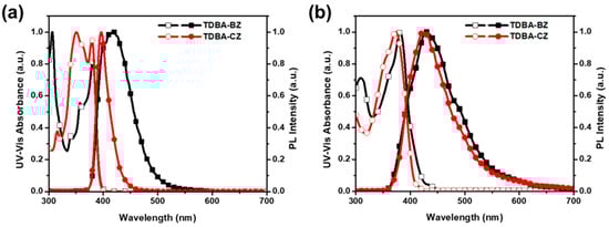 - Jin, P.; Yang, X.; Su, W.-T.; Zhan, S.-H.; Chen, X.; Sun, H.; Yang, B.; Su, S.-J.; Hu, J.-Y. Narrow emission band ultraviolet/deep-blue thermally activated delayed fluorescence emitters modified with carbazole/carboline as a donor. J. Mater. Chem. C 2024, 12, 19498–19505. [Google Scholar] [CrossRef]