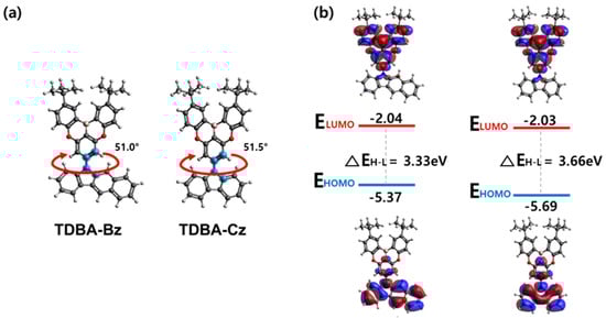 - Han, J.; Huang, Z.; Miao, J.; Qiu, Y.; Xie, Z.; Yang, C. Narrowband blue emission with insensitivity to the doping concentration from an oxygen-bridged triarylboron-based TADF emitter: Nondoped OLEDs with a high external quantum efficiency up to 21.4. Chem. Sci. 2022, 13, 3402–3408. [Google Scholar] [CrossRef] [PubMed]