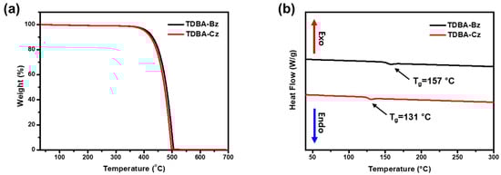 - Park, C.Y.; Park, S.H.; Kwon, N.Y.; Park, J.Y.; Kang, M.J.; Kwak, H.; Son, J.H.; Woo, H.Y.; Hong, C.S.; Cho, M.J.; et al. Polymer Hosts Containing Carbazole-Dibenzothiophene-Based Pendants for Application in High-Performance Solution-Processed TADF-OLEDs. ACS Appl. Mater. Interfaces 2024, 16, 45242–45251. [Google Scholar] [CrossRef]