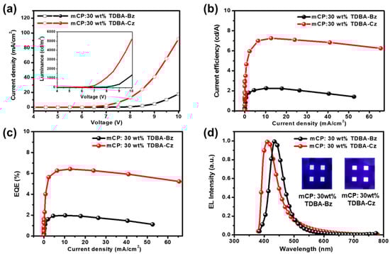 | mCP: 30 wt% TPDBA-CZ | 6.82 | 7.25 | 6.98 | 6.45 | 6.14 | (0.167, 0.086) | 413 | 59 |