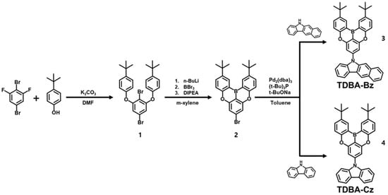 2.1.4. Synthesis of 9-(2,12-Di-tert-butyl-5,9-dioxa-13b-boranaphtho[3,2,1-de]anthracen-7-yl)-9H-carbazole (TDBA-Cz) (4)