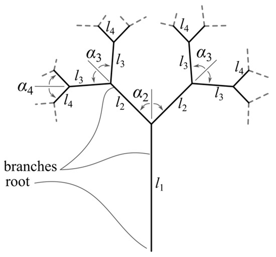 Figure 1 shows a scheme of the proposed three-like fractals. The following parameters are defined (which allows the variation of tree-like fractal geometry):
