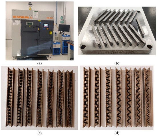 Figure 4 shows the SLM equipment and the manufactured samples. Each test sample model was manufactured 3 times for consistency; however, only one batch of test samples is shown in