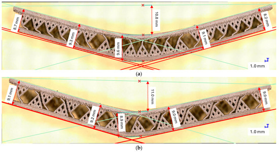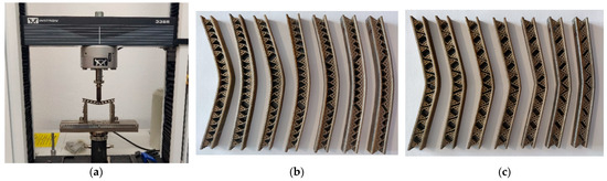 Figure 5 shows the testing equipment with the mounted sample and the tested samples, deformed, after the bending tests. The testing equipment uses data denoising filters to cut off frequencies higher than half of the sampling frequency (the cutoff frequency was 5 Hz).
