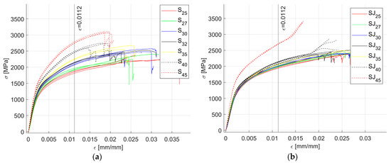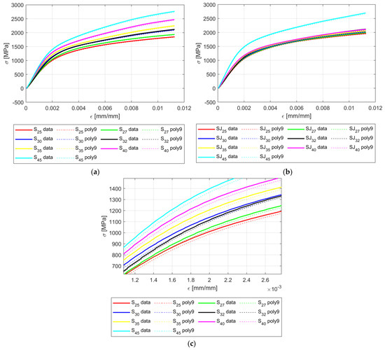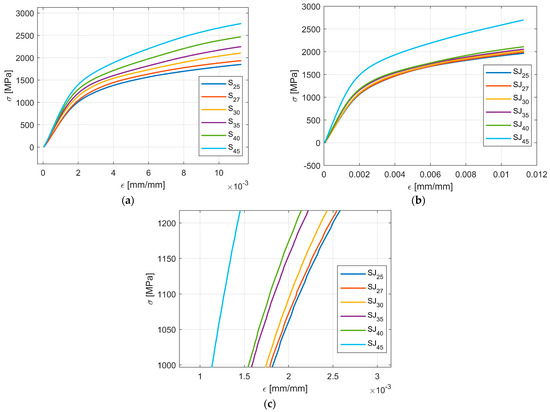 Figure 8 illustrates the shape of σ-ε curves based on the value of the angle parameter α. As seen in both cases, for the S fractal configuration and SJ fractal configuration, the trend remains the same, namely, an increase in the angle parameter α produces an increase in the σ to ε ratio, i.e., the apparent amplitude of the σ-ε curves increases with the increase in α. In addition, the change in the σ-ε curve shapes seems smooth for both fractal configurations S and SJ.