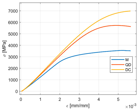 Figure 5). For each sample, the experiments recorded data until a threshold of σ = 7000 [Mpa] or until a fracture occurred on the sample. Since there were 3 samples for each model, the data were grouped accordingly to allow further processing (the baseline data were defined as the mean data between the 3 tested samples of each configuration/angle). The sampling frequency of the testing equipment was set to 10 [Hz].