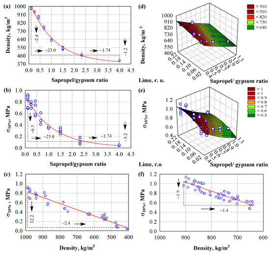 Statistical data analysis showed that at the same material density of ~650 kg/m3 (Figure 1a,f), the difference in compressive stress between sapropel/gypsum and sapropel/gypsum/lime reaches ~46.7%, and for a density of ~900 kg/m3 (Figure 1a,f), the difference in compressive stress between sapropel/gypsum and sapropel/gypsum/lime reaches ~50.4%. It can be assumed that adding lime to the sapropel/gypsum mixture significantly increases compressive stress. We determined that its rational amount is 10% of the amount of gypsum. A higher amount of lime has no or negligible effect on stress. The use of lime in various mixtures is often described. Elert et al. [54] conducted a detailed analysis of the effect of lime on gypsum mortars.