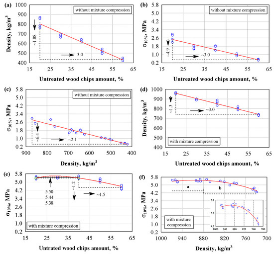 Dependence of the density and compressive stress of the composites on the amount of chemically untreated wood chips and additional coating of the mixture when the sapropel/gypsum ratio is 30/70: (a–c) specimens without mixture compression; (d–f) specimens with mixture compression; ○—experimental data; ─── average line.