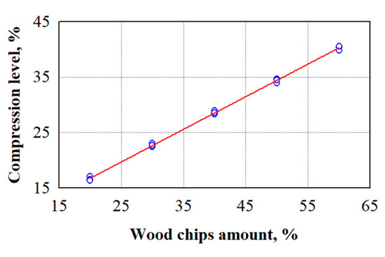 The analysis of the experimental studies on the evaluation of the compression level showed a statistically significant difference in the results obtained; the statistic of the F-criterion was 8625 and p = 0. The dependence of the compression level on the amount of wood chips can be described by the following regression expression, Equation (1):