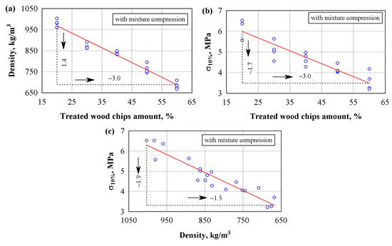 Chemically treated wood chips with sodium carbonate lost up to 30% of their mass due to the washing out of fine and soluble particles. Loss of mass from wood chips led to changes in the density and strength indicators of the composite. Figure 4 shows the dependence of the physical properties of specimens made from compressed mixture and chemically treated chips. Table 7 presents the regression equations for the resulting dependencies; see Equations (4),(7) and (8). The analysis of the experimental results shows that when the amount of wood chips increases by 3 times, the properties of the specimens decrease linearly: the density of the specimens decreases by 1.4 times (Figure 4a) and the compressive stress by 1.7 times (Figure 4b). The dependence of compressive stress and density showed that when the density decreased from ~1003 to 668 kg/m3, the compressive stress decreased by ~1.9 times (Figure 4c).