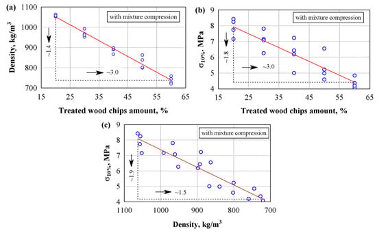 Dependencies of density and compressive stress of specimens prepared from compressed mixture and chemically treated wood chips when gypsum and lime are used only: (a)—density on wood chips amount; (b)—compressive stress on wood chips amount; (c)—compressive stress on density; ○—experimental data; ─── average line.