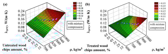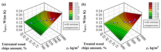 The compressive strength deteriorates when the sapropel is used, but the thermal insulation properties improve. Multi-criteria regression analysis was applied to process the experimental measurement results to estimate the thermal conductivity of the composite material more accurately. After a mathematical–statistical analysis was performed, it was possible to calculate the values of the thermal conductivity based on the obtained results of the density and amount of wood chips. The graphical expression of the results of the experimental thermal conductivity values is shown in Figure 6a,b and Figure 7a,b, and the statistical processing results are shown in Table 8, Equation (11).