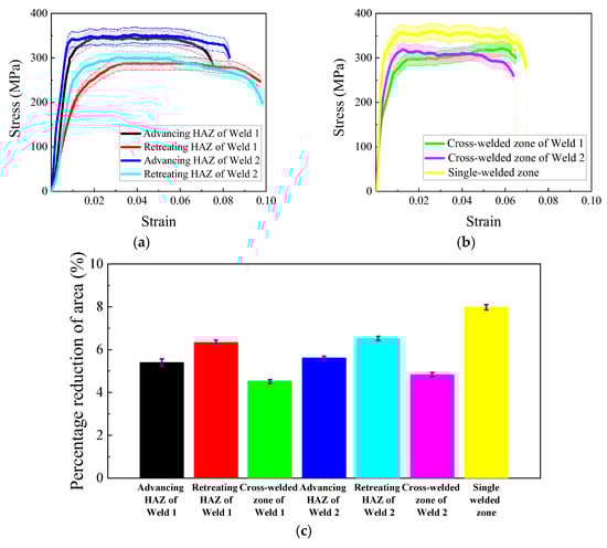 - The advancing HAZ exhibits superior yield strength compared to the retreating side, and the cross-welded zone displays significant strength degradation relative to the single-welded zone. The ductility in the cross-welded zone is lower than that of the single-welded zone, while the HAZ demonstrates greater ductility compared with the weld zone. The advancing side appears to have second-phase particles, which are smaller than the retreating side. The retreating side exhibits more voids and dimples than the advancing side, which explains the higher fracture strain observed on the retreating side. The cross-welded zones exhibit a reduction in Al2CuMg precipitate density compared to the single-welded zone, coupled with shallower voids versus the single weld.