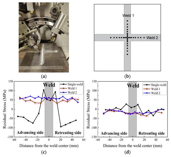 - The longitudinal direction residual stress profile of the cross-welded joint does not exhibit the typical “double peak” characteristic. The cross-welded zone shows an elevation in longitudinal residual stress compared to the single-welded zone, while the TMAZ in both Weld 1 and Weld 2 demonstrates stress reductions. Transverse stress components present near-uniform distributions in Weld 1.