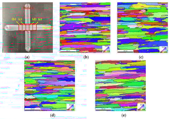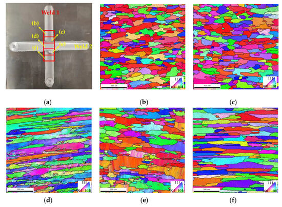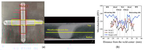 - The cross-welded joint exhibits lower hardening responses, and the lowest microhardness is localized in the retreating TMAZ of Weld 1. Cross-welded zones exhibited elongated grains, which were attributed to shear-dominated deformation during overlapping probe interactions. The advancing TMAZ and the cross-welded zone exhibit maximum strain localization, correlating with elevated residual stresses. In Weld 2, The WZ exhibits relatively uniform strain distribution due to dynamic recrystallization, generating strain-free grains, while the advancing HAZ demonstrates localized strain concentration exceeding the retreating HAZ.