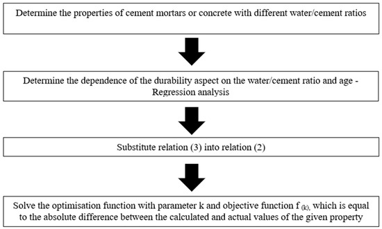After determining the dependencies of the durability aspects, the k-value was determined using an optimisation problem. To calculate the k-value for each durability aspect, the water/cement ratio was replaced by (3) in the above-mentioned dependence (2).
