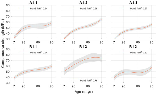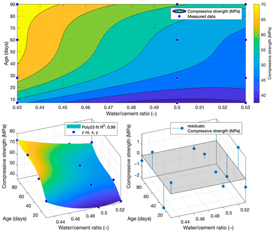 The following function was determined for compressive strength using regression analysis, as shown in Figure 4. The coefficient of determination of this function was 0.99.