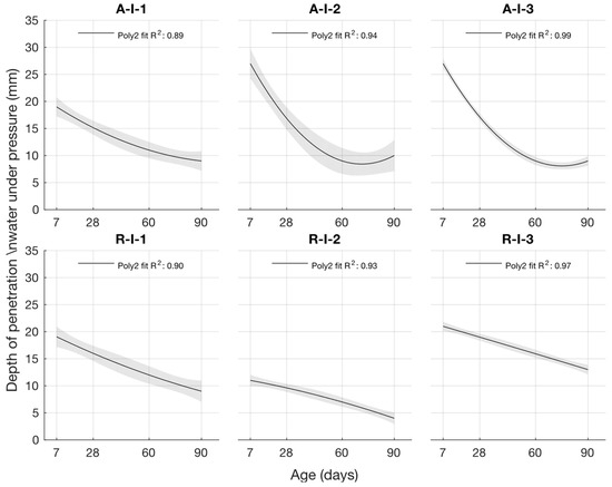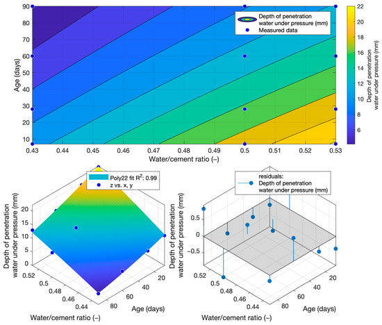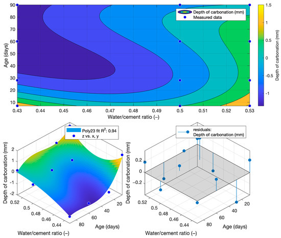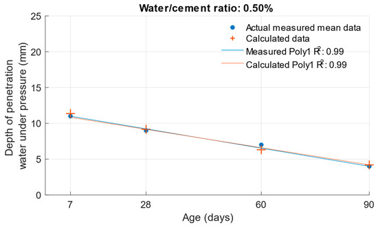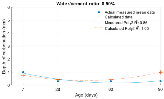 To determine the k-value for the durability aspects (in this case, the depth of penetration of water under pressure and the depth of carbonation), age- and water/cement ratio-dependent functions were developed for each property. These functions were created using regression analysis, with the property as the dependent variable and age and water/cement ratios as the independent variables. Predominantly polynomial dependencies (e.g., Equation (2)) were chosen for the preparation of these functions so the resulting dependencies would have a high coefficient of determination (R2) or would describe the course of the dependency as accurately as possible.