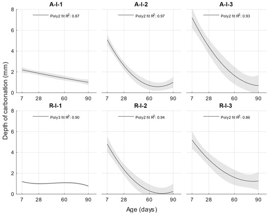 For carbonation depth, the determined function had the lowest coefficient of determination at only 0.8373. For this reason, the carbonation depth values used to determine the carbonation depth function were converted to the natural logarithm according to Equation (8). Since the carbonation depth results had a similar waveform to that of the exponential function, a high coefficient of determination was not achieved when using polynomial regression analysis. For this reason, a logarithmic transformation was used.