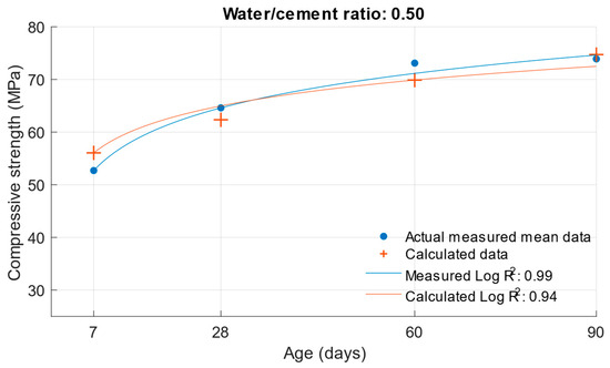 Figure 5, Figure 6 and Figure 7 show no significant deviations between the actual and calculated compressive strength values for the water/cement ratios shown. These values are compiled in Table 4, where the differences of the residuals, i.e., the differences between the measured compressive strength and the one calculated utilising the function used, are shown. In particular, the largest deviations occurred for the compressive strength results at ages of 7 and 28 days. It can be concluded that for a given age, the calculated k-values will not completely match those determined using Formula (1).