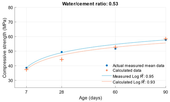 The coefficient of determination R2 = 0.9404 was determined for this function. From this, it can be concluded that the compressive strength function is sufficiently accurate for calculating the compressive strength of cement mortars with water/cement ratios of 0.5, 0.43, and 0.53. To better see the difference between the actual compressive strength values and the calculated values, Figure 5, Figure 6 and Figure 7 show these values for each water/cement ratio, and the numerical difference is provided in Table 4.