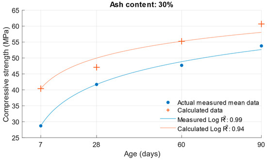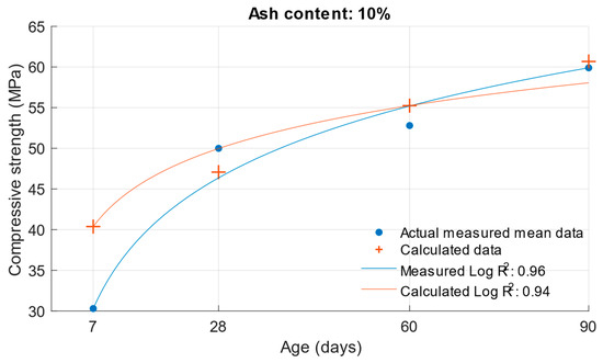 The same calculation can be performed for the strength of cement mortars with fly ash. Substituting Formula (3) into the compressive strength function Equation (6), the compressive strength of cement mortar with fly ash can be calculated after substituting the values. In this calculation, the k-value was used in Formula (3), which was calculated using the optimisation problem; the procedure is presented in Section 2. The following graphs and Table 5 show the differences between the calculated and measured compressive strength values for the different cement replacements with fly ash.