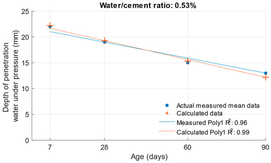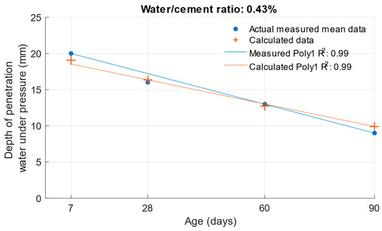 The following graphs show the differences between the actual and calculated depth of penetration of water under pressure with different water/cement ratios. Figure 16 and Figure 17 show that for the water/cement ratios of 0.43 and 0.5, the largest difference was at the ages of 60 and 28 days. For a water/cement ratio of 0.53, shown in Figure 18, the largest difference between the calculated and measured values of depth of penetration of water under pressure was at an age of 90 days. The differences between the actual and calculated depth of penetration of water under pressure did not reach high values. The largest difference was a water/cement ratio of 0.5 at an age of 7 days, and this difference was only 0.94 mm. Numerical differences between measured and calculated depth of penetration of water under pressure with different water/cement ratios are shown in Table 7.