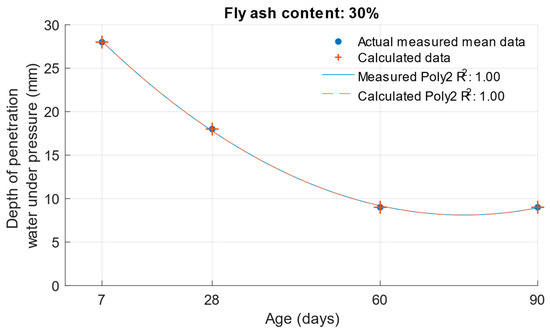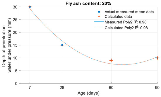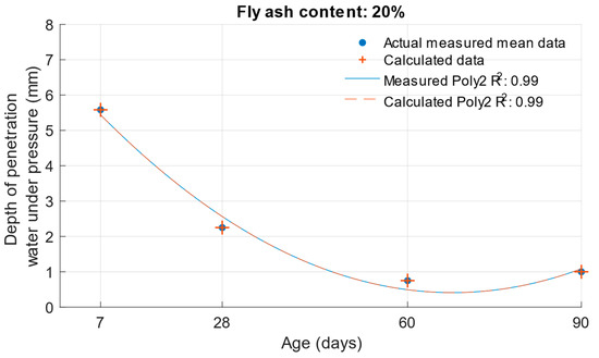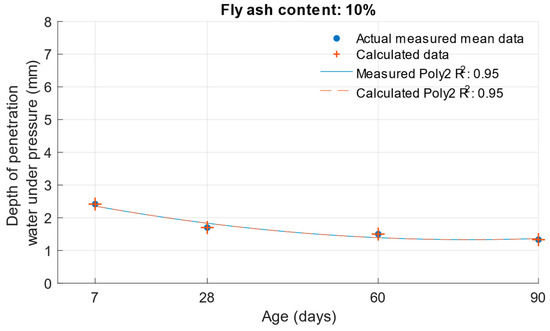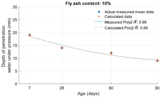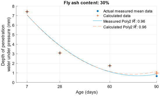 When calculating the depth of penetration of water under pressure for different cement substitutes with fly ash, the difference between the measured and calculated values was less than 0.01 mm. This corresponded to the high coefficient of determination of the depth of penetration of water under pressure function. Differences between measured and calculated depth of of pressurised water penetration with different fly ash content are shown in Figure 19, Figure 20 and Figure 21. Numerical differences between measured and calculated depth of penetration of water under pressure are shown in Table 8.