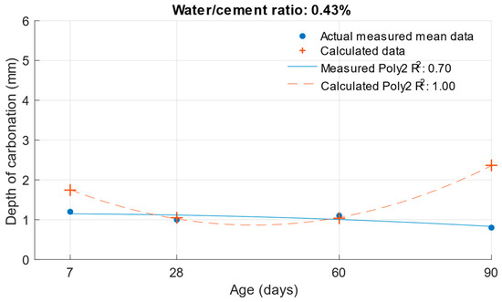 Difference between measured and calculated depths of carbonation with water/cement ratio of 0.43.