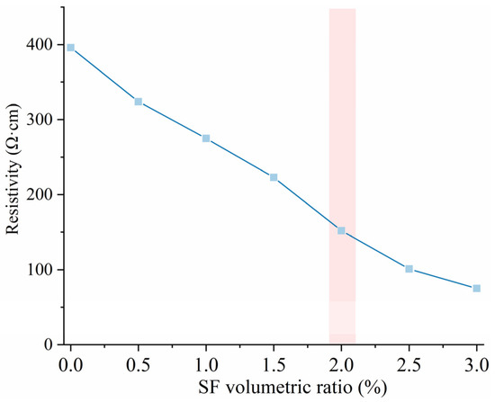 Among the multiple factors, the determination of SF contents is of significance, because it is the foundation for the continuous electric-induced heating curing process. Excessive steel fiber content adversely affects the fluidity of the mixture. Therefore, steel fiber content in concrete structures should not be overly high. However, when steel fiber content is too low, the internal steel fibers in high-performance concrete become insufficient to form fully interconnected conductive pathways, leading to excessively high initial resistivity that hinders electrical energy supply. Consequently, it is essential to determine an optimal steel fiber dosage to ensure a successful electric-induced heating curing process and facilitate the effective preparation of SF-HPC in low-temperature environments. In this work, the optimal SF contents were determined based on the experimentally measured percolation threshold, taking the initial resistivity as the judgement standard.
