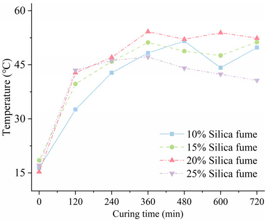 Figure 2 depicts the temperature development of SF-HPC specimens with different silica fume contents during the electric-induced heating curing process at −20 °C. It can be observed from Figure 2 that, in the heating stage, with the increase in silica fume contents, the slope of the curing temperature growth of the specimen increased first then decreased. When the silica fume content was 20 wt%, the temperature of the electric-induced heating cured specimens increased the fastest, and the temperature rise slope was the largest. This may be because an excessive amount of silica fume may have an impact on the fluidity of the matrix at subzero temperatures. In the constant-temperature stage, the temperature of the specimens with 15 wt % and 20 wt % silica fume can be stabilized above 50 °C, and the specimens with 20 wt % silica fume have better temperature stability. However, with the increase in silica fume content, the specimens with 25 wt % silica fume showed very poor temperature stability. It can even be said that, under such conditions of silica fume content, the specimens do not have stable heating ability, which seriously affects the efficiency of OH curing of specimens in subzero-temperature environments. This was also considered to be the effect of excessive silica fume content on the fluidity of the specimens.