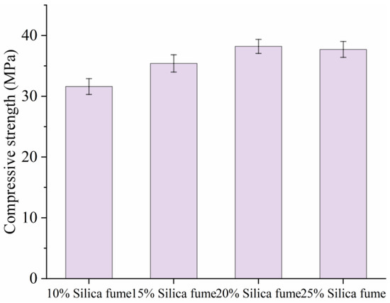 Figure 3 depicts the compressive strengths of SF-HPC with various silica fume contents cured by 12 h electric-induced heating curing at −20 °C. It can be seen from Figure 3 that, similar to the law of temperature development, with the increase in silica fume content, the mechanical properties of the specimens first showed an increasing trend and then a decreasing trend. The specimens with 10~25 wt% silica fume contents had values of 31.6 MPa, 35.4 MPa, 38.2 MPa, and 37.7 MPa, respectively. The highest compressive strength can be found in the specimen incorporating 20 wt% silica fume. With an increasing silica fume content, the decrease in strength of OH curing specimens may be attributed to two reasons. On the one hand, as shown in Figure 2, the curing temperature of specimens with 25 wt% silica fume during electric-induced heating curing in a subzero-temperature environment was lower than that of specimens with 20 wt% silica fume, which had an adverse effect on the development of the compressive strength of specimens. On the other hand, when the content of silica fume was too high, it will compete with the cement inside the specimen, resulting in a lower amount of hydrated cement. Based on the experimental results, the optimal silica fume content was determined to be 20 wt%.