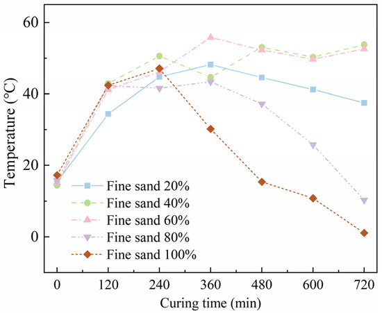 This section mainly studies the influence of the ratio of coarse sand and fine sand on the curing temperature and compressive strength of SF-HPC at −20 °C. The experiment was divided into five groups, and the proportions of fine sand replacing coarse sand were 20%, 40%, 60%, 80%, and 100%, respectively. To be more specific, the particle size range of coarse sand was 1.5~2 mm, and the particle size range of fine sand was 0.84~1.5 mm. Based on the above two groups, the volume content of steel fiber was 2 vol%, and the silica fume content was 20 wt%. In this section, the water–binder ratio was fixed at 0.25. The specific mix ratio is shown in Table 5 below.