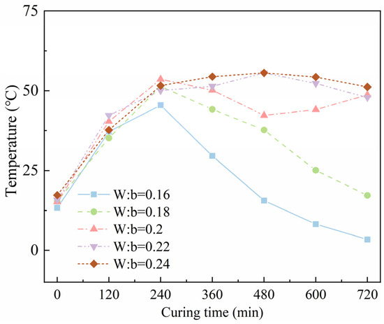 For HPC composite, the water-to-binder ratio is a key factor affecting the performance of the specimen, as it influences the hydration reaction and material density. This section mainly studies the change in temperature and compressive strength of electric-induced heating cured SF-HPC in the early curing process at −20 °C under different water–binder ratios. The experiment was divided into five groups, and the water–binder ratio was set to 0.16, 0.18, 0.2, 0.22, and 0.24, respectively. The specific mix proportion is shown in Table 6 below.