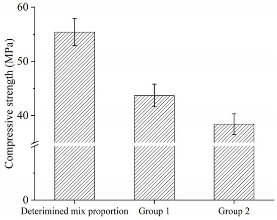 To prove the effectiveness of the determined mix proportion for electric-induced heating cured SF-HPC, two other mix proportions were taken as examples for comparison. In Group 1, the silica fume content, fine sand replacement ratio, and water-to-binder ratio were 15 wt%, 40%, and 0.22, respectively; in Group 2, the silica fume content, fine sand replacement ratio, and water-to-binder ratio were 10 wt%, 40%, and 0.18, respectively. Two-hour electric-induced heating curing was conducted to prepare the specimens with an environmental temperature of −20 °C, and the compressive strength results are exhibited in Figure 8. It can be found from Figure 8 that the compressive strengths of Group 1 and Group 2 were much lower than that of the determined mix proportion, indicating the above experiments were helpful to pre-determine the optimal silica fume, water-to-binder ratio, and fine aggregate replacement ratio. Under this circumstance, the determined mix proportion was further used to evaluate the effectiveness of the curing regime.
